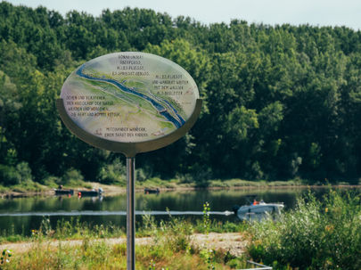 Kunstinstallation zur Fischwanderhilfe beim Donau-Kraftwerk Altenwörth. An drei Orten wurden Treffpunkte für Jung und Alt geschaffen, die Bewusstsein für die besonderen Tierarten der renaturierten Umgebung schaffen sollen.
